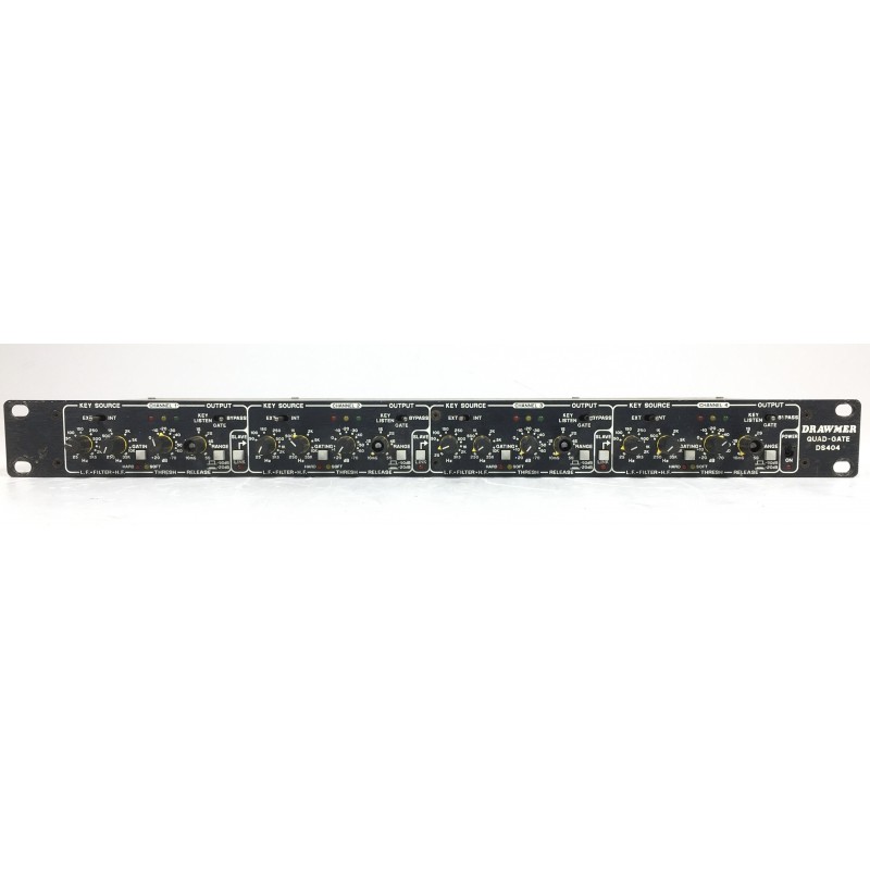 Il Drawmer DS404 Quad Gate è un gate mande in England che può operare in modalità mono o link, ad azionare il gate può essere il filtro interno, molto utile se c'è qualche frequenza fastidiosa da eliminare o per ridurre il rischio di inneschi, o da una sorgente esterna