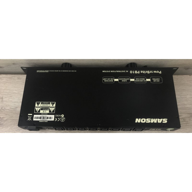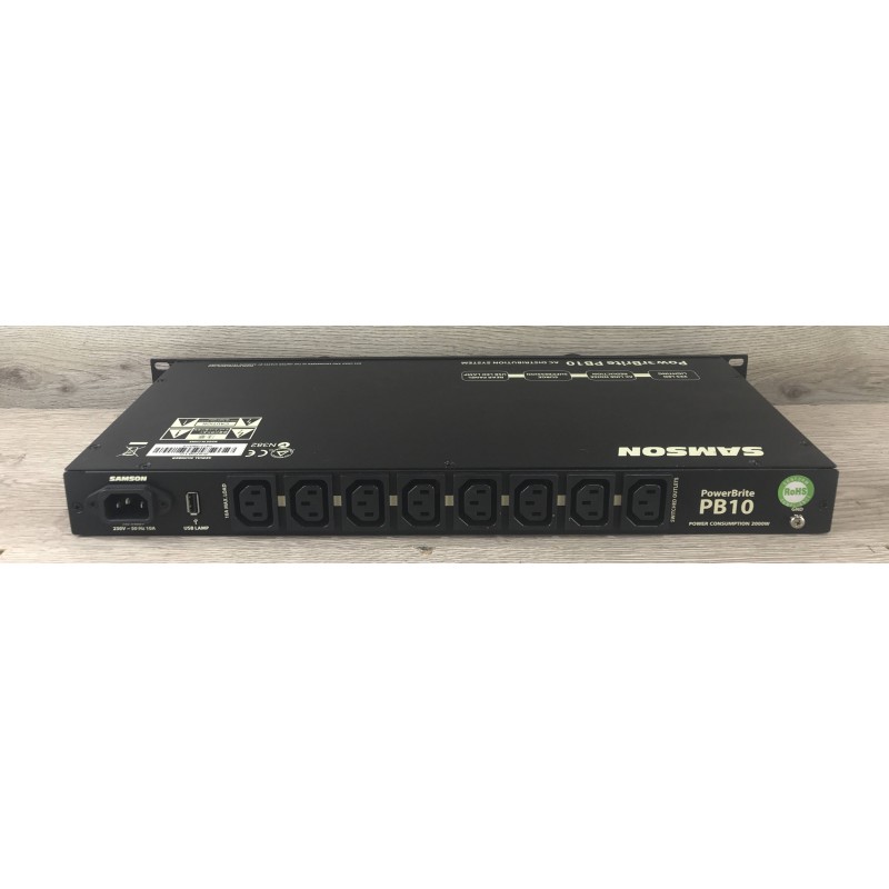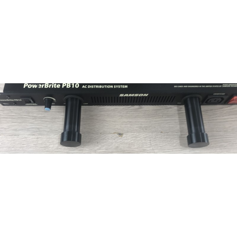 Il Samson PB10 PowerBrite è un condizionatore e distributore di alimentazione montabile in rack da 19" (1U), usato in studi audio e impianti live. Distribuisce corrente a più dispositivi e li protegge da sovratensioni, picchi di tensione e disturbi elettrici (RFI/EMI). Dispone di 8 prese posteriori e 1 frontale, più interruttore automatico da 10 A di protezione. Sul pannello frontale ha luci LED con dimmer e una lampada a collo d'oca per illuminare il rack.