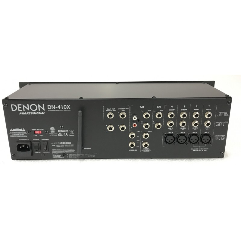 Il Denon DN 410X è un mixer analogico da installazione dotato di 10 canali di cui 4 ingressi microfonici e 3 stereo di linea, ogni canale ha il sui trim per il gain, eq alti e bassi e doppia mandata aux, fade professionale da 100 mm e ricevitore bluetooth con il quale è possibile inviare musica da qualsiasi apparecchio fino a 30 mt