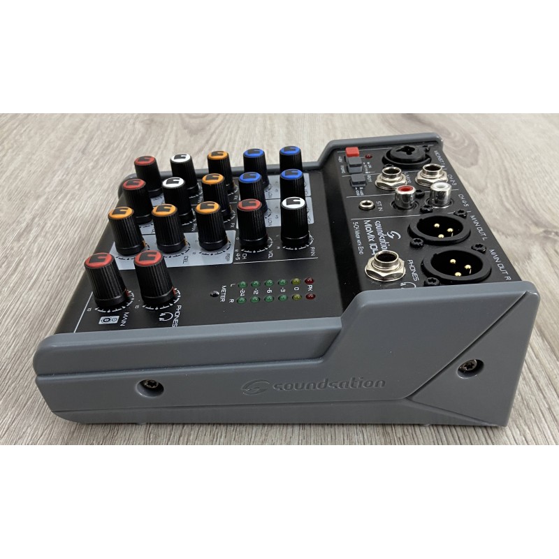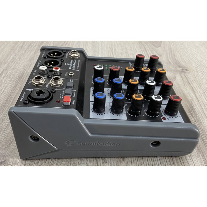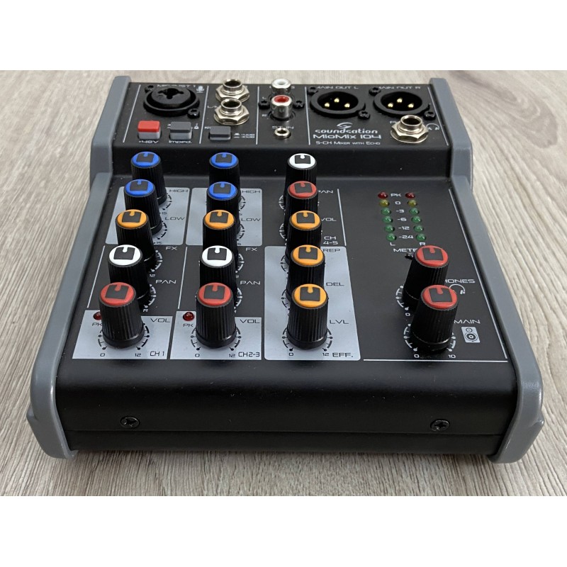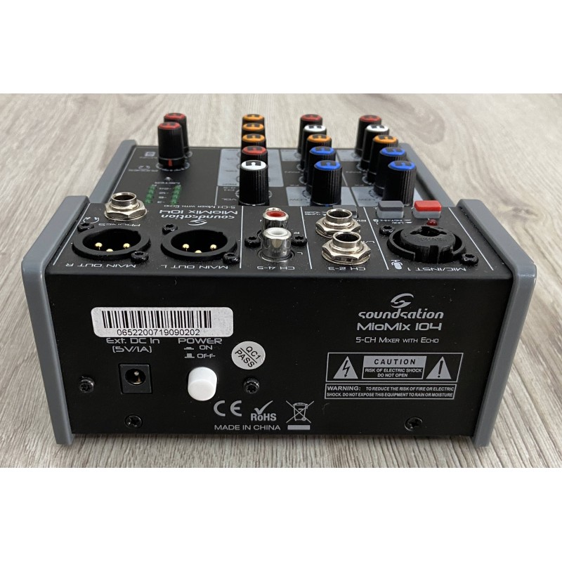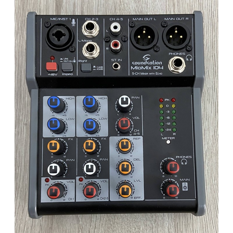 Il Soundstation Miomix 104 è un piccolo mixer analogico 5 canali con effetto eco regolabile incorporato, premaplificatore microfonico con phantom power, eq 2 bande , uscita cuffie con volume indipendente, ed uscite bilanciate in formato cannon