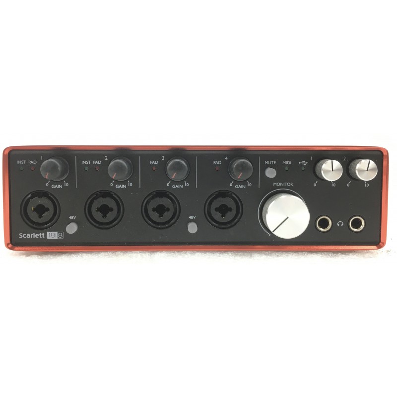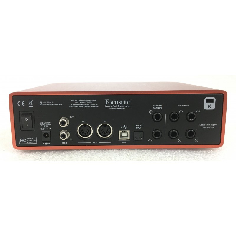 La Focusrite Scarlett 18i8 2gen è una delle schede intermedie della fortunata famiglia di interfacce audio di Focusrite, con una frequenza di campionamento fino a 192 khz è dotata di 4 ingressi analogici con preamplificatore e phantom power, 4 ingressi di linea analogici, 2 uscite analogiche per i monitor e due uscite cuffie indipendenti, inoltre grazie all'ingresso adat è possibile espandere la scheda di altri 8 ingressi attraverso cavo ottico