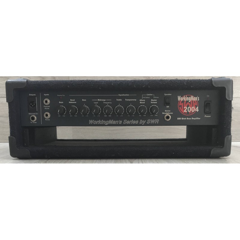 La SWR Workingman's 2004 è una potente testata per basso da 200 W a 4 ohm, solida e versatile, con EQ attivo, Aural Enhancer e limiter integrato. Offre uscita bilanciata XLR, loop effetti, e uscita cuffie, ideale per live o studio. Costruzione robusta in rack rivestito di moquette blu. Suono pulito e definito, ma non caldo come un valvolare.