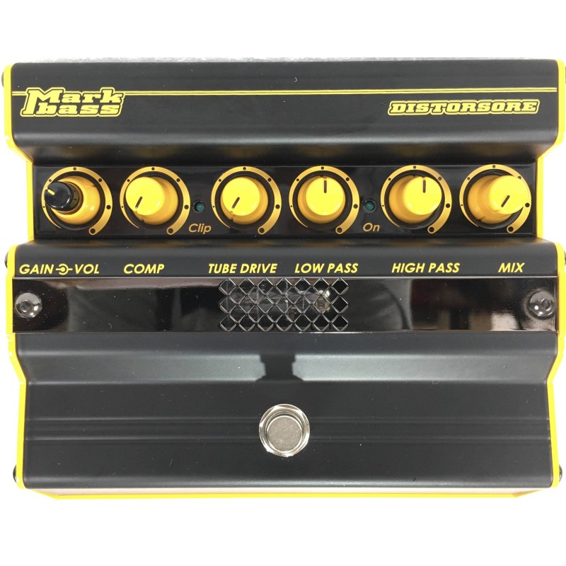Markbass Distorsore è un distorsore e compressore valvolare per basso che grazie alla funzione mix permette di miscelare il suono pulito con il suono distorto, i filtri low pass e hi pass permettono di delimitare la banda d'azione del pedale per ottenere timbriche interessanti e moderne