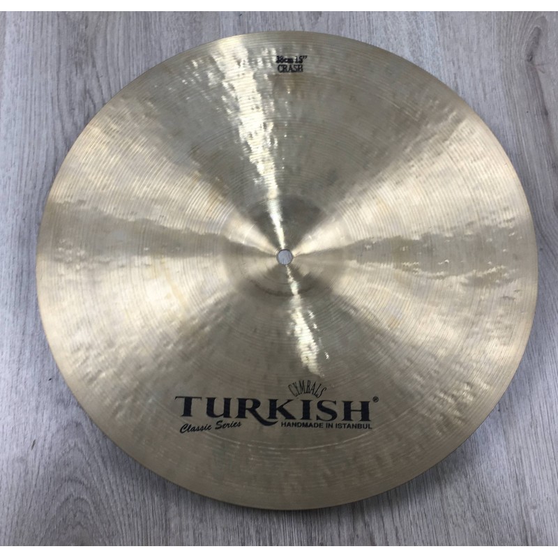 Il piatto Turkish Crash 15" è un modello di piatto artigianale in lega di bronzo B20, martellato a mano a Istanbul. Offre un suono brillante e reattivo, con attacco veloce e decadimento breve. Ideale per accenti precisi e contesti acustici o di piccole dimensioni. Garantisce un timbro caldo e musicale, tipico della tradizione turca.