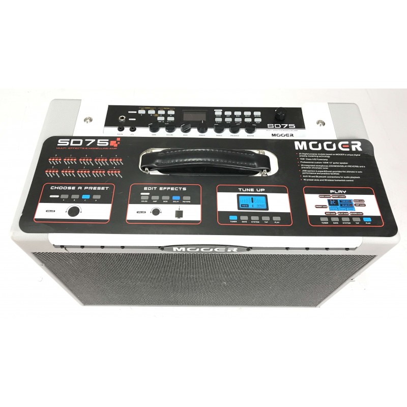 Il Mooer SD 75 Combo è un amplificatore per chitarra 75W in class A/B con 24 modelli fisici di amplificatori per chitarra tra i più famosi e usati, 8 tipi di distorsione,9 effetti di modulazione, 5 delay,6 riverberi, accordatore integrato, 40 preset memorizzabili, loopstation, connettività bluetooth e tanto altro ancora