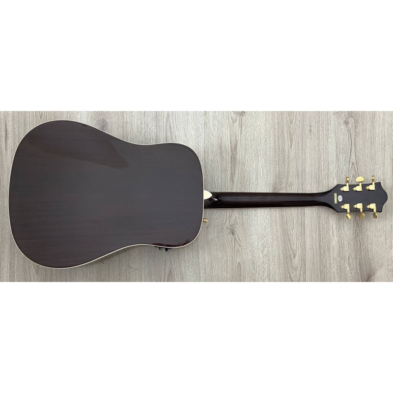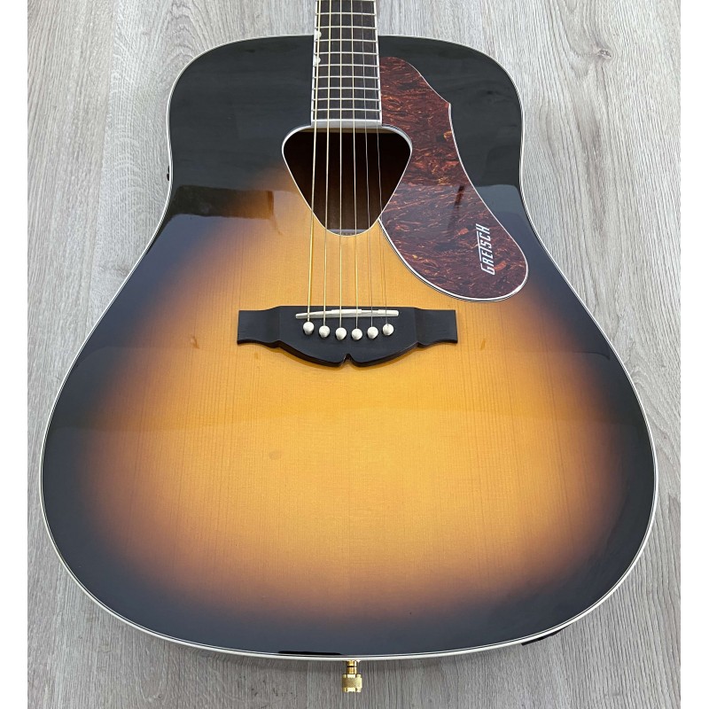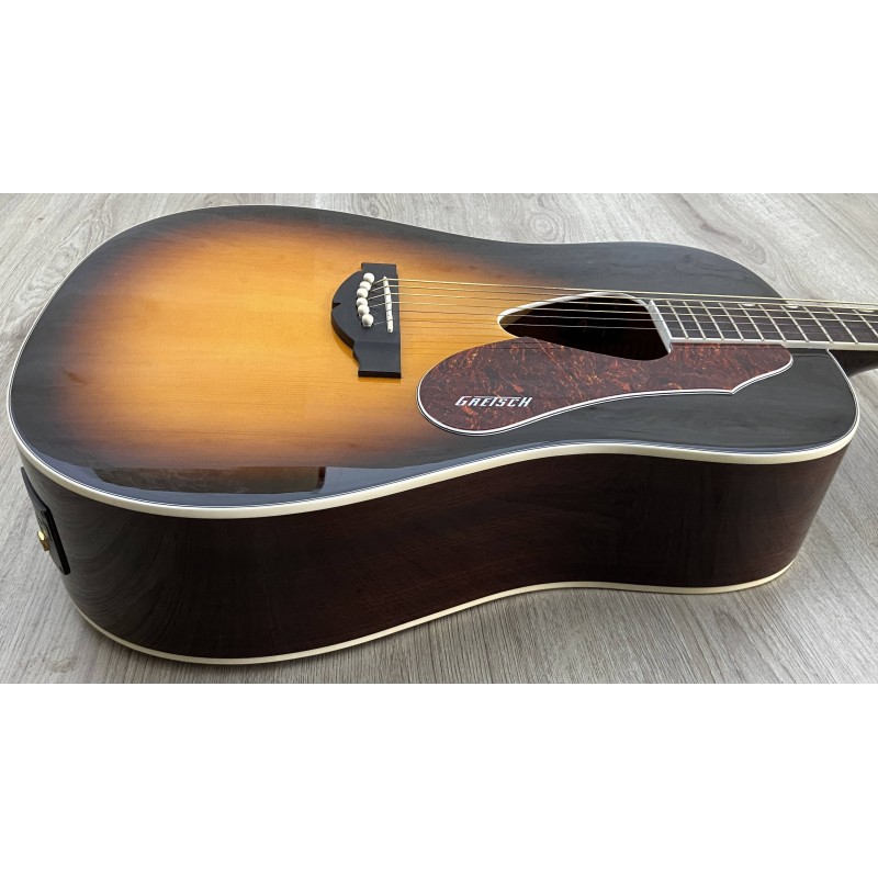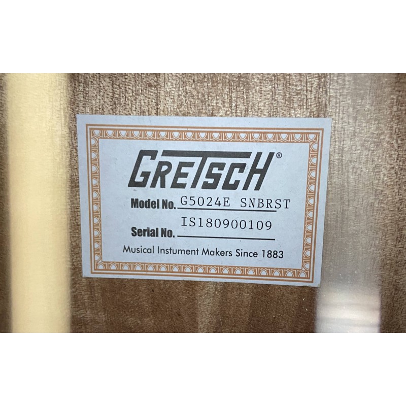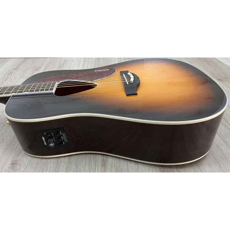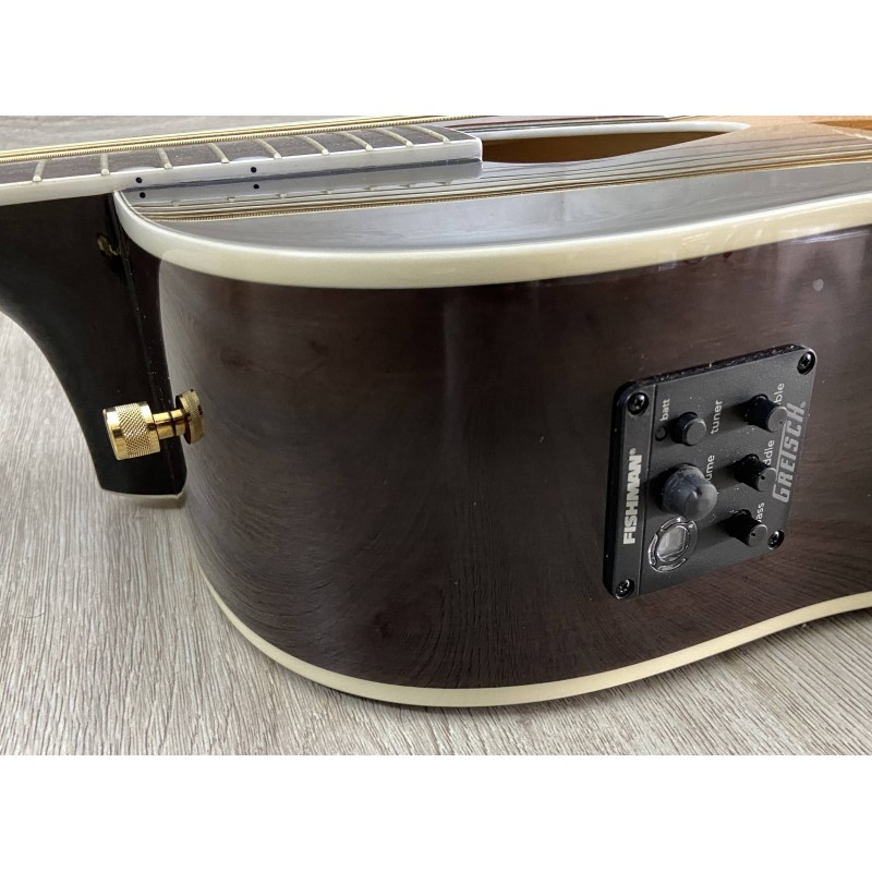 Gretsch G5024E è una chitarra acustica dai particolari raffinati, prezzo contenuto e elettronica integrata per un suono amplificato dalle elevate prestazioni. Le caratteristiche premium includono un top in abete massello rilegato con rinforzi smerlati a X e la classica buca triangolare rilegata Rancher. Il corpo è formato dai lati in mogano e da un fondo arcuato rilegato. Il manico è in mogano con tastiera in palissandro a 21 tasti con intarsi Neo-classic, ponte compensato con base in palissandro, meccaniche deluxe e hardware color oro. Il pickup Fishman Sonicore e il sistema di preamplificazione lsys+ offrono grandi prestazioni amplificate, con controlli di volume, tono e fase, indicatore di batteria e accordatore integrati.