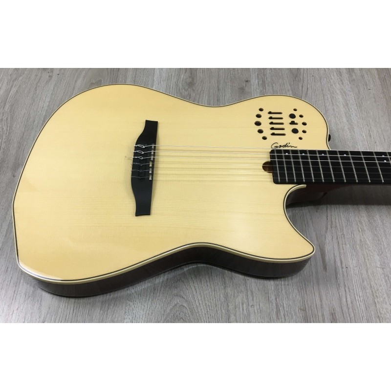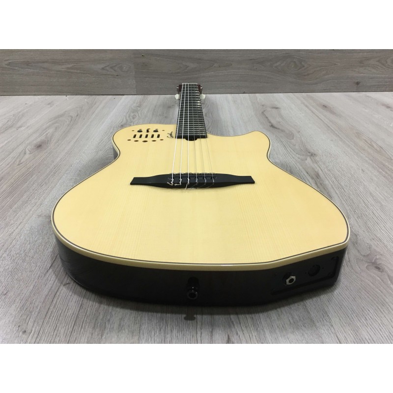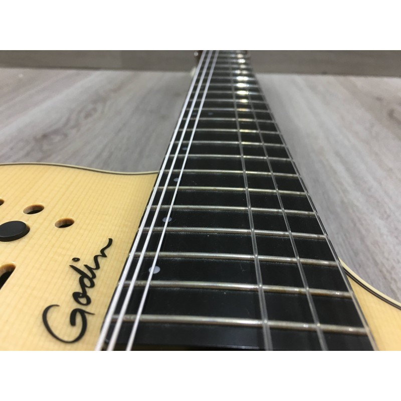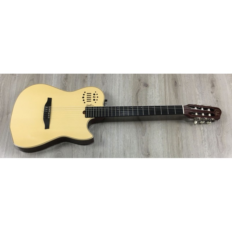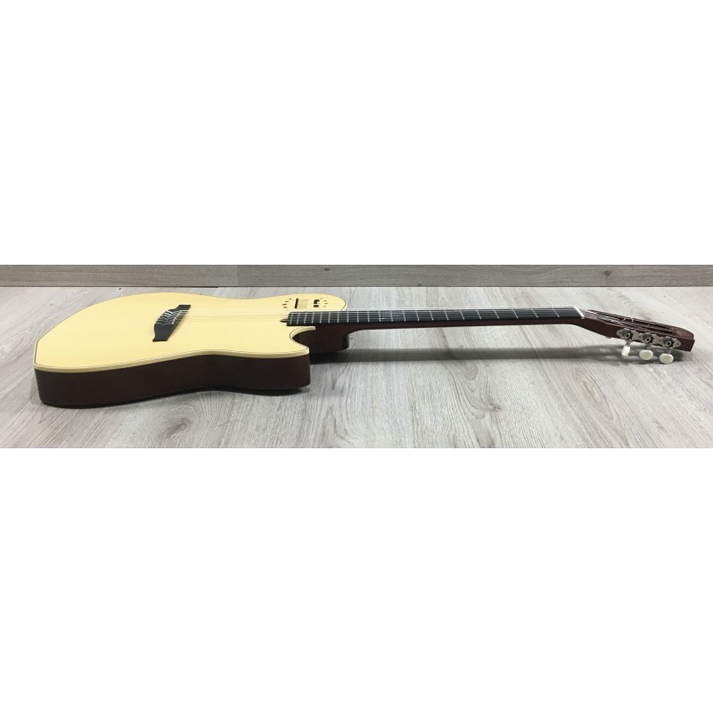 La Godin Multiac Nylon SA è una chitarra classica a corde di nylon che fonde un design acustico innovativo con un'elettronica all'avanguardia per l'uso live senza feedback. Caratterizzata da un corpo in mogano con due camere tonali e un top in abete massello, offre un timbro ricco e bilanciato che si adatta a vari generi musicali. Il sistema di pickup esafonico RMC Custom include un connettore a 13 pin, permettendo l'accesso diretto a sintetizzatori per chitarra come la serie Roland GR. La tastiera radiata e il manico confortevole la rendono ideale anche per chi è abituato alle chitarre elettriche o acustiche con corde in metallo.