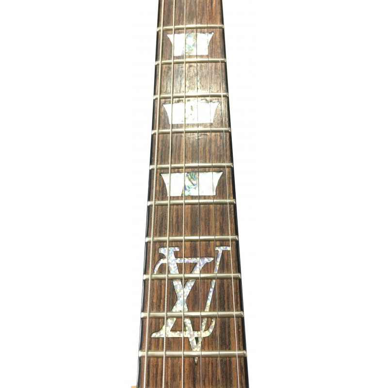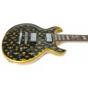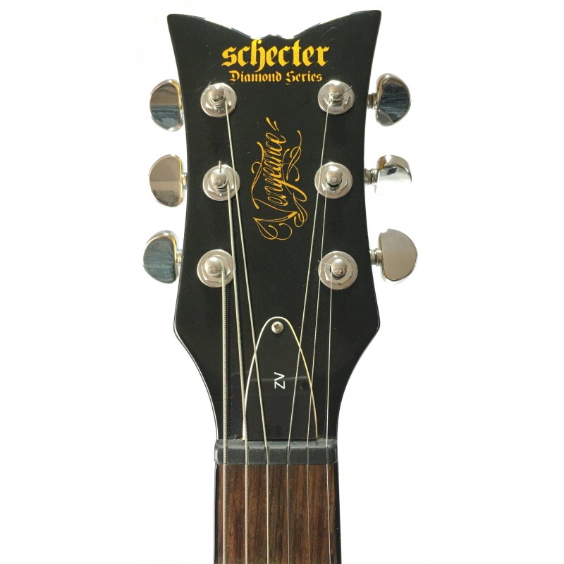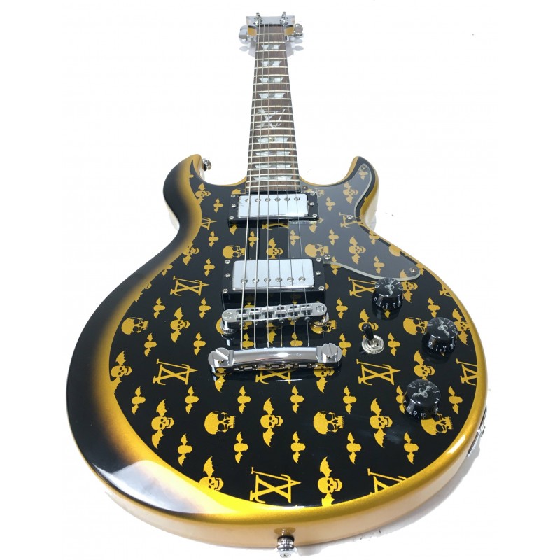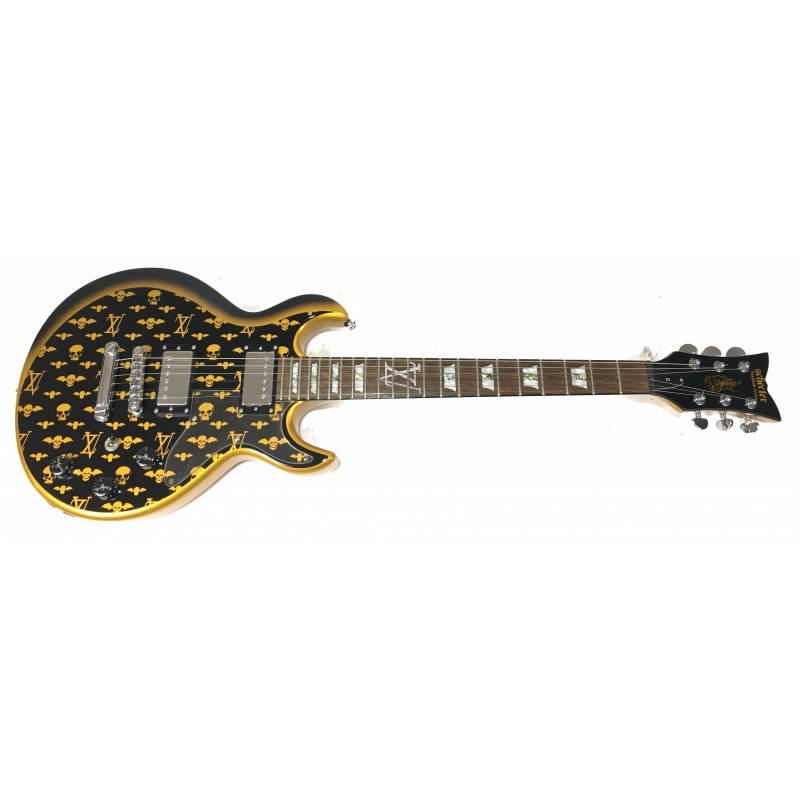 La Schecter Vengeance Blade Custom è una chitarra elettrica solidd boy signature di Zacky Vengeance con grafica ispirata al logo di Luis Vuitton, corpo e manico in mogano tastiera in palissandro, intarsio glitterato al 12° tasto, elettronica a due pickup humbucker con selettore a 3 posizioni, doppio controllo volume e tono, meccaniche groover e hardware dorato