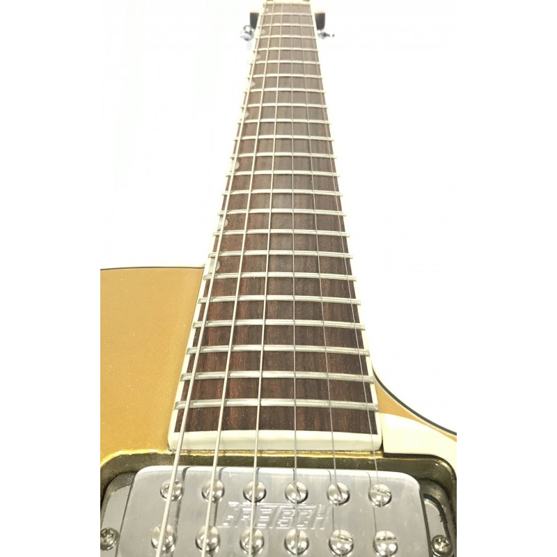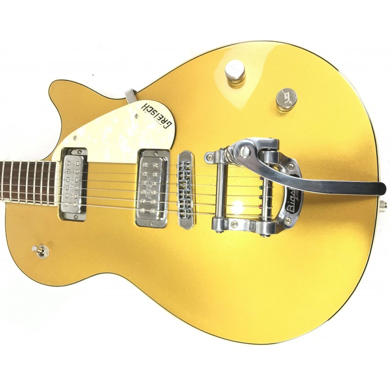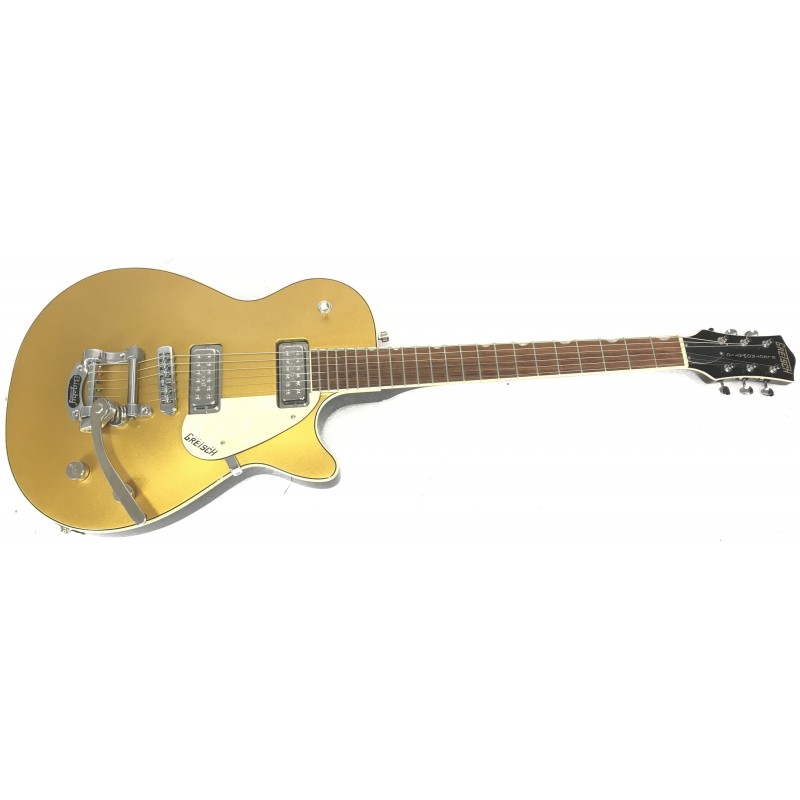 La Gretsch Pro Jet G5235T Bigsby 125th Anniversary 2008 Gold è una chitarra elettrica commemorativa per i 125 anni della casa americana con finitura gold, corpo e manico in mogano, tastiera in palissandro, ponte bigsby pickup mini humbucker con selettore a tre posizioni