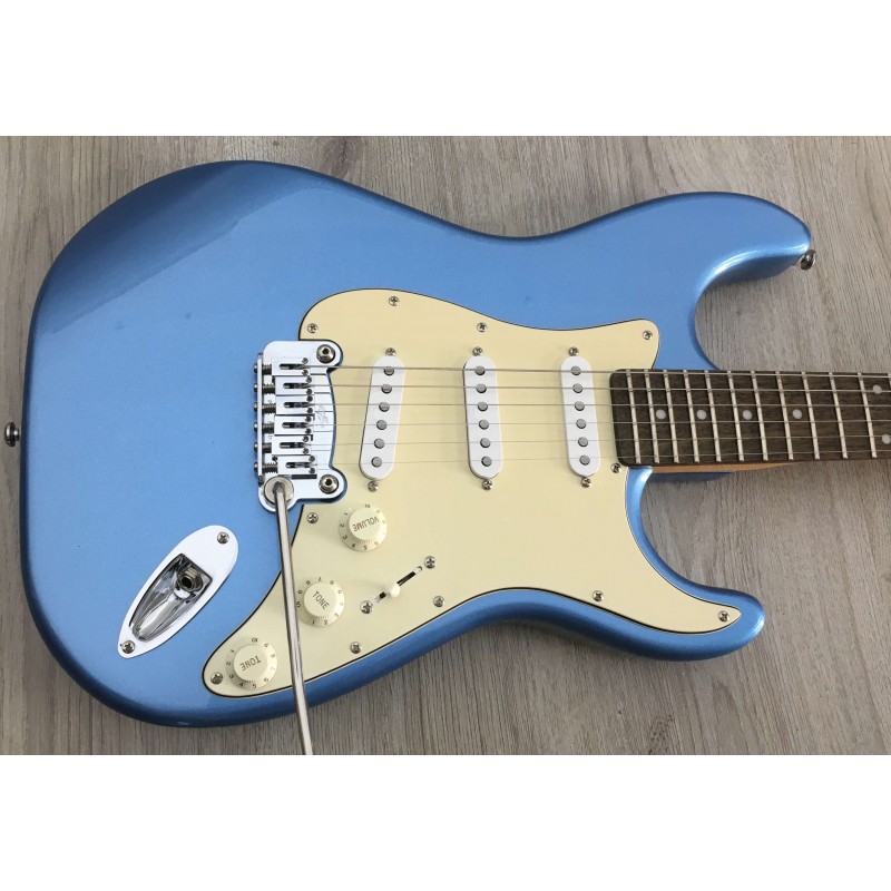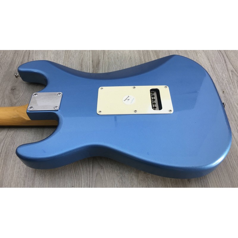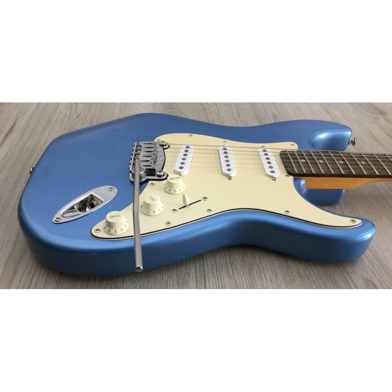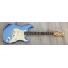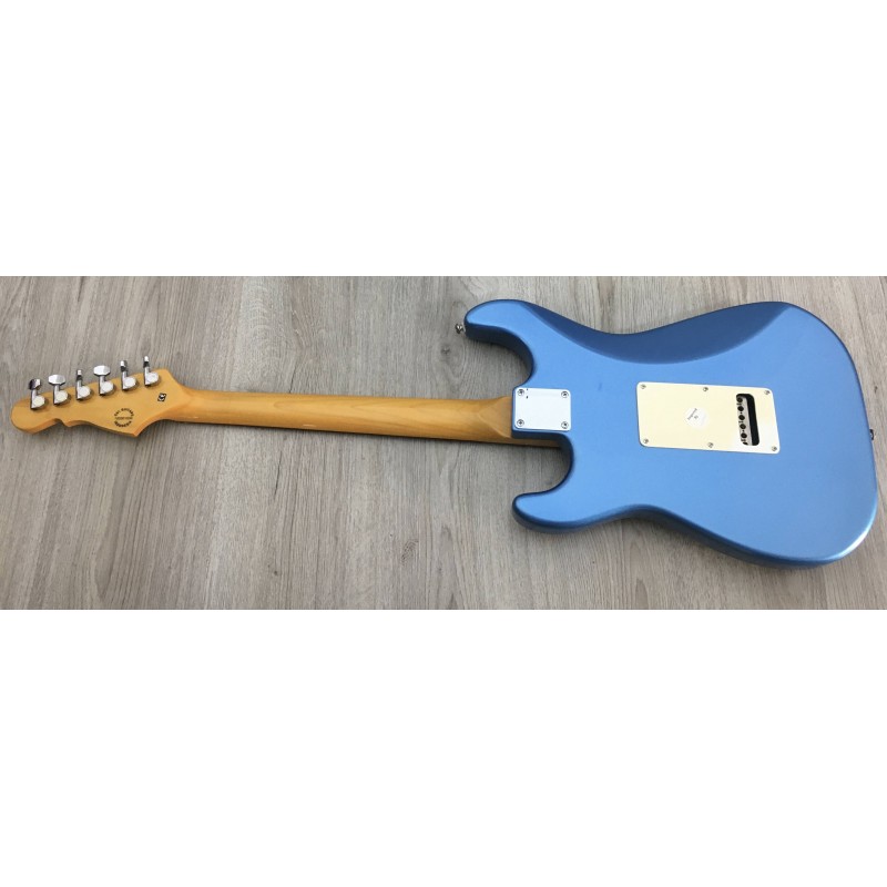 G&L Legacy Tribute Lake Placid Blue è una chitarra elettrica solid body che ricorda lo stile timbrico ed il feeling degli strumenti vintage ma con la precisione ed affidabilità di uno strumento moderno; corpo in pioppo, manico in acero con tastiera in palissando con profilo medium C, elettronica SSS con controllo volume e due toni e selettore a 5 posizioni; leva vibrato dual fulcrum