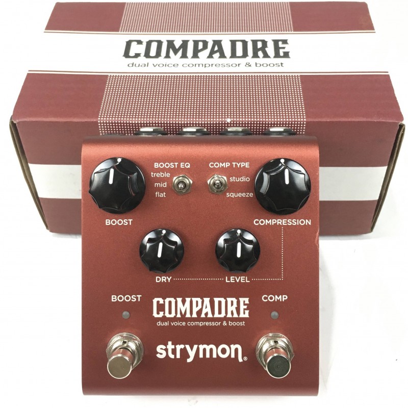 Lo Strymon Compadre Dual Voice Compressore Boost è un pedale analogico che racchiude innumerevoli funzioni, è un compressore con doppia modalità operativa, studio o squeeze, ha un boost integrato che può lavorare sia in flat, incrementando semplicemente il volume senza alterare il timbro dello strumento oppure è possibile applicare un'equalizzazione e/o una saturazione, in fine il comando dry permette di miscelare il suono pulito con quello processato per avere un effetto di parallel compression. Gestibile anche via MIDI