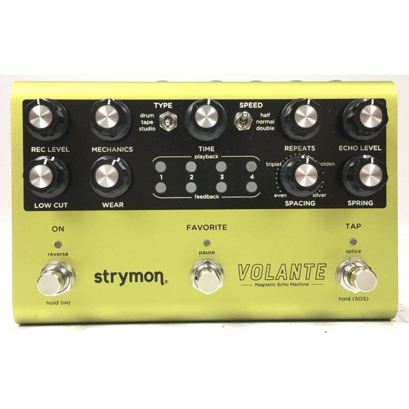 Strymon Volante Magnetic Echo Machine è un delay stereo che replica esattamente il comportamento di un echo a nastro vintage a multi testina dotato di riverbero a molla. Ogni sfumatura viene catturata, dal movimento meccanico all'usura del nastro, il suono viene reso fedelemente grazie ai convertitori a 96 bit di cui è dotato, il tutto gestibile in modo intuitivo e veloce attraverso i controlli dedicati o anche via midi all'interno di un sistema più complesso