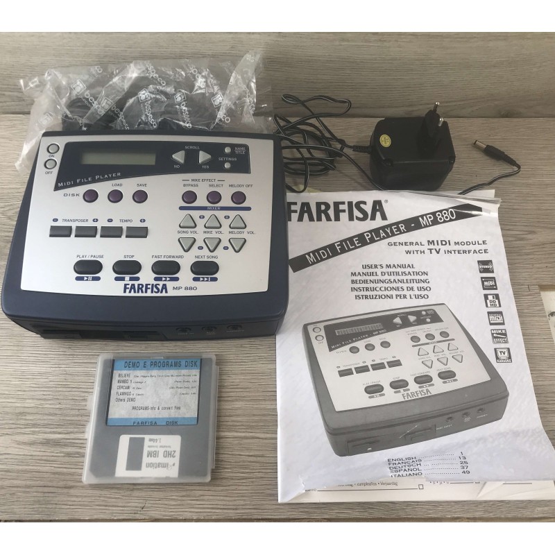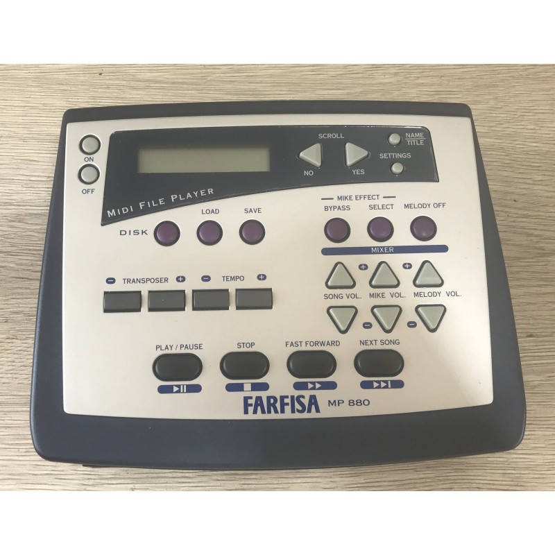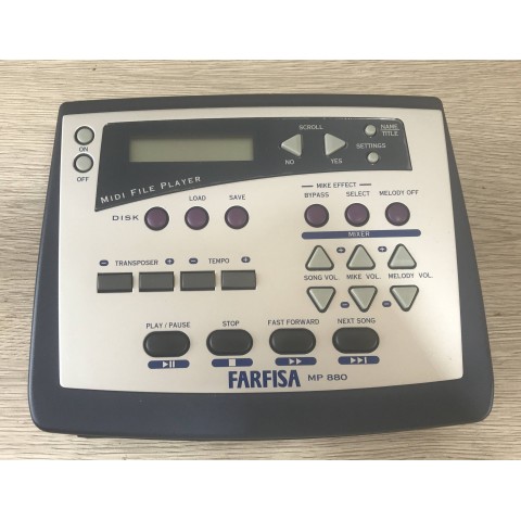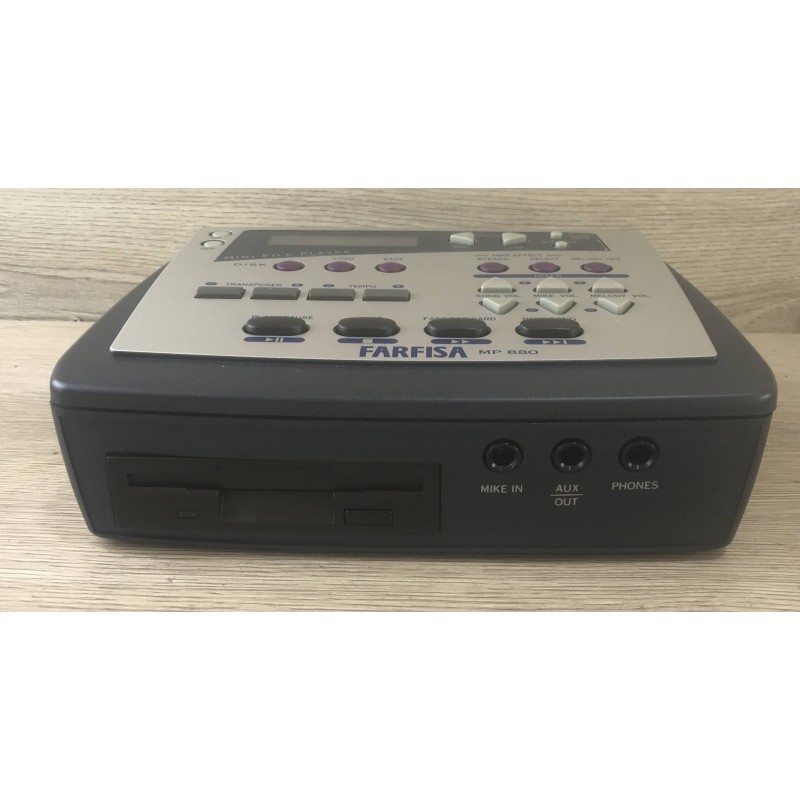 Il farfisa MP880 è un lettore basi midi karaoke made in Italy su floppy disk con possibilità di escludere la traccia vocale, effetti sull'ingresso microfonico, volume base indipendente ed uscita video con testo